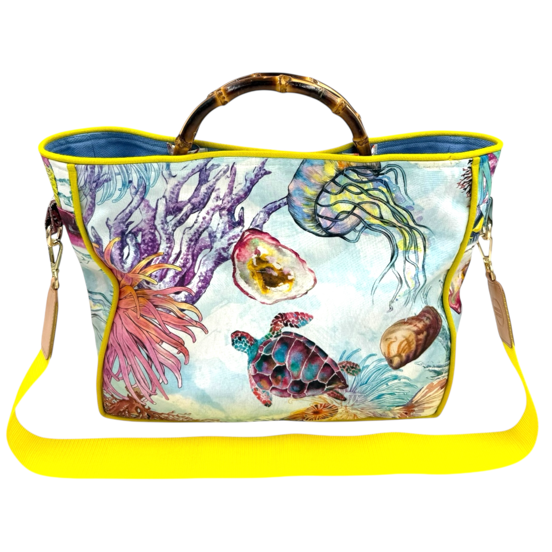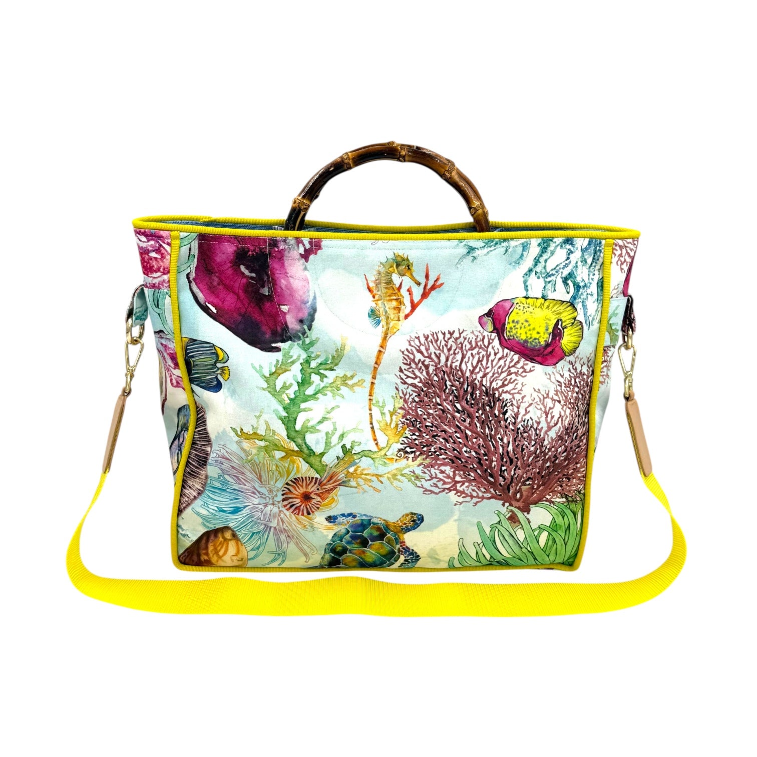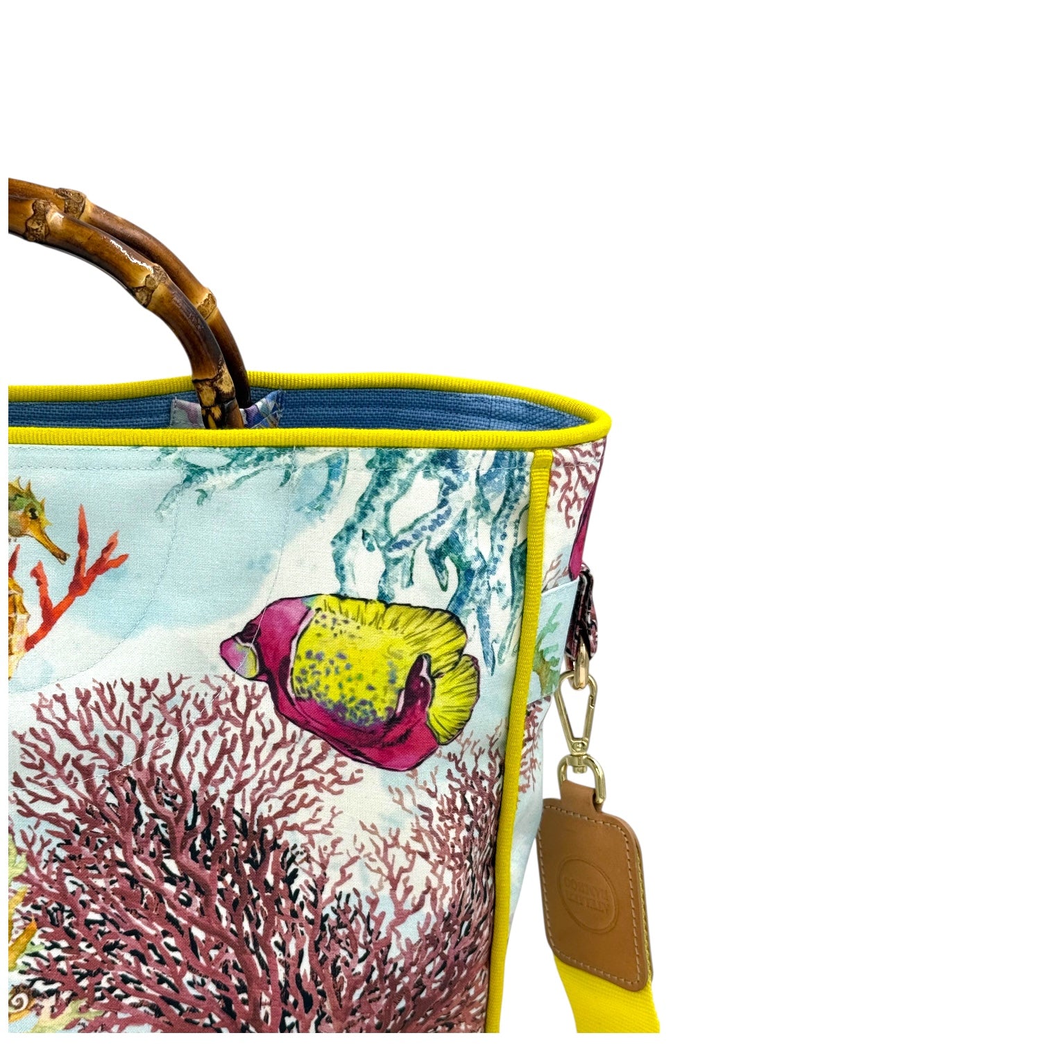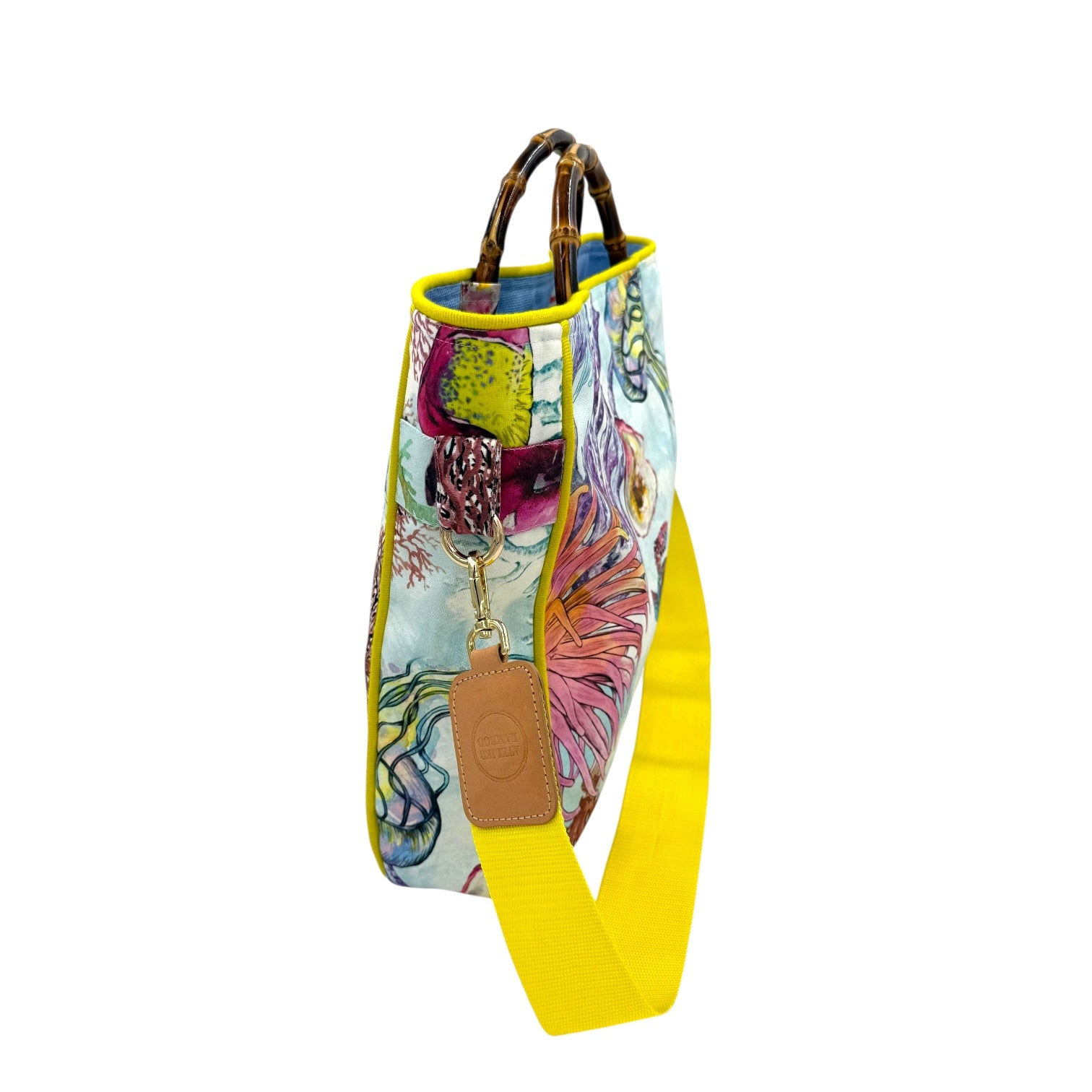 Lightweight tote bag, featuring an inner pocket and a golden magnetic clasp. Carry it by the bamboo handles or crossbody with the optional and entirely detachable shoulder strap.